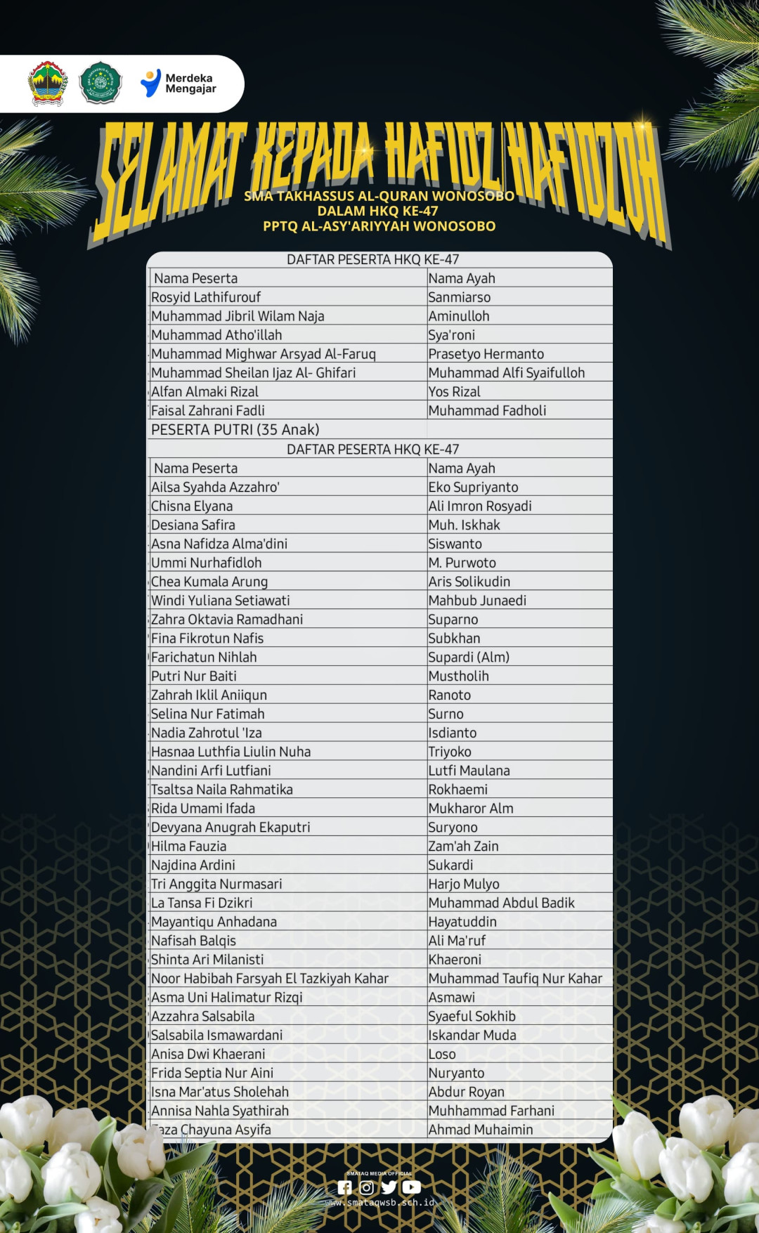 Kegiatan Haflah Khotmil Qur'an diikuti oleh peserta dari berbagai latar belakang pendidikan, termasuk 42 siswa dari SMA Takhassus Al-Qur'an yang terdiri dari 7 putra dan 35 putri. Keikutsertaan mereka menunjukkan dedikasi dan semangat dalam menghafal dan memahami Al-Qur'an, serta menjadi inspirasi bagi peserta lainnya.