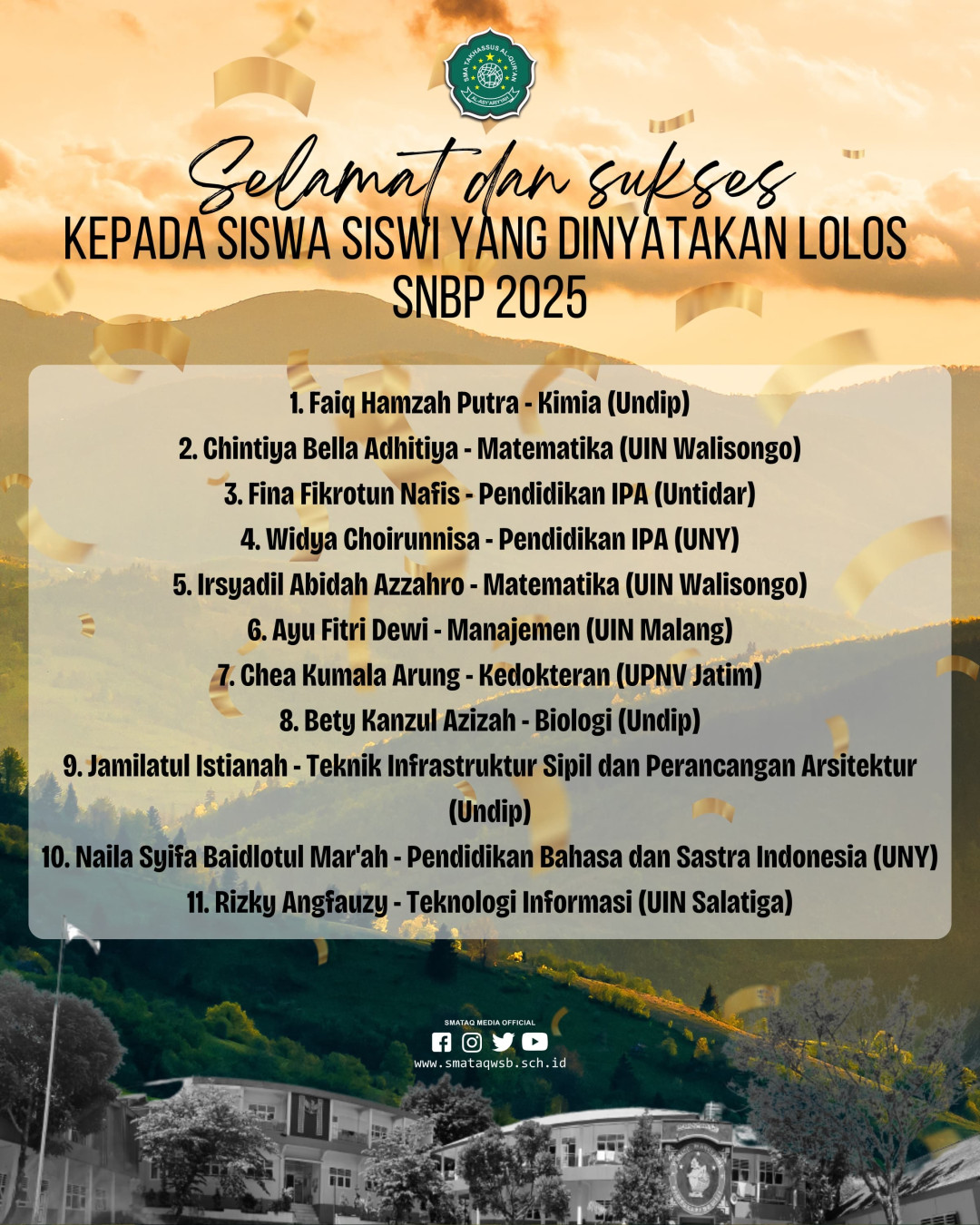 Dengan pencapaian ini, diharapkan siswa-siswi yang lolos SNBP dapat terus belajar dengan semangat dan memberikan kontribusi terbaik di perguruan tinggi masing-masing. Selamat dan sukses bagi para siswa yang telah meraih mimpi mereka!