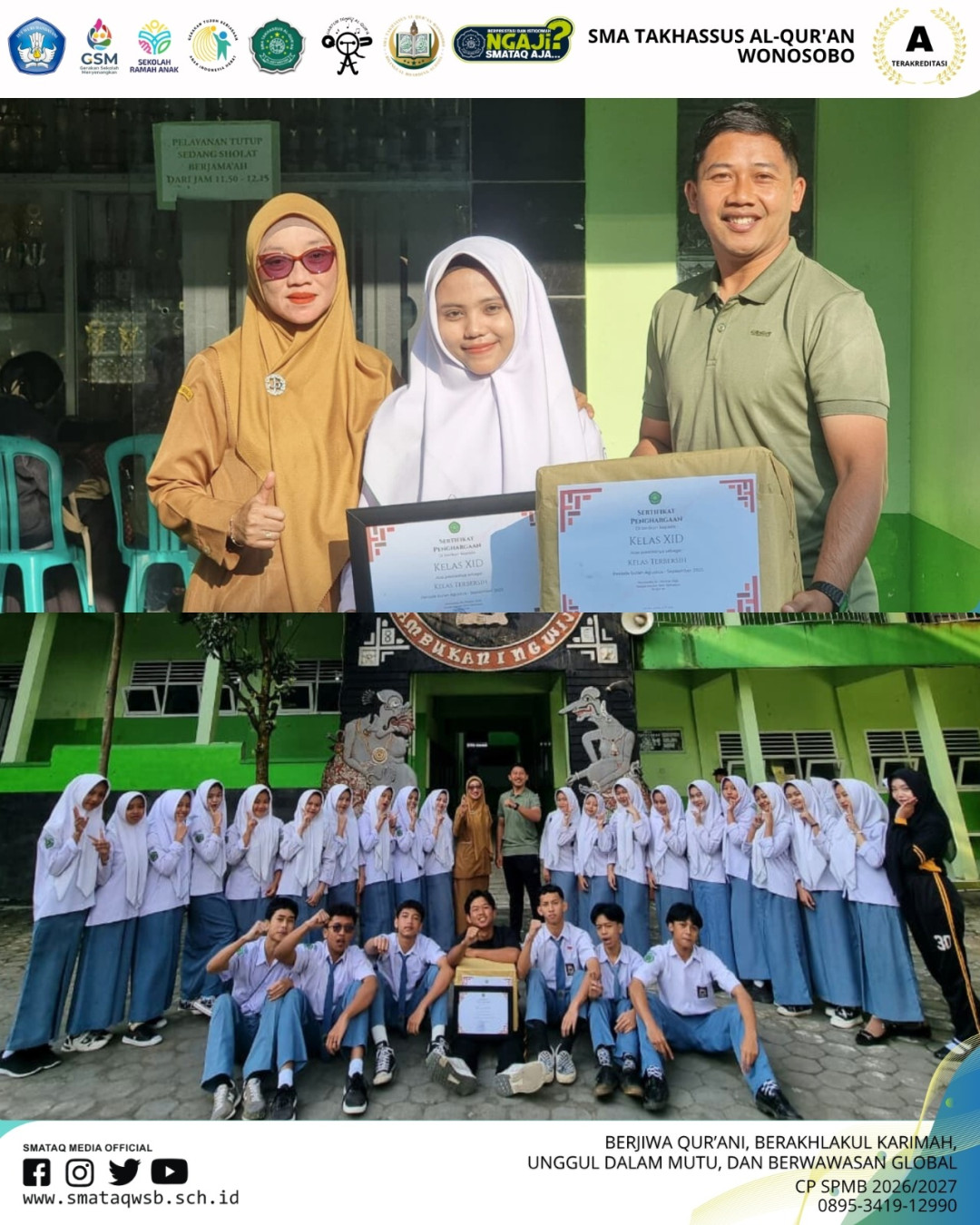 Wonosobo — Semangat menjaga kebersihan kembali dibuktikan oleh kelas XI D SMA Takhassus Al-Qur’an Wonosobo yang berhasil meraih Juara Kebersihan Sekolah. Penghargaan ini diberikan sebagai bentuk apresiasi terhadap kelas yang mampu menjaga dan merawat lingkungan belajarnya dengan rapi, indah, dan nyaman.