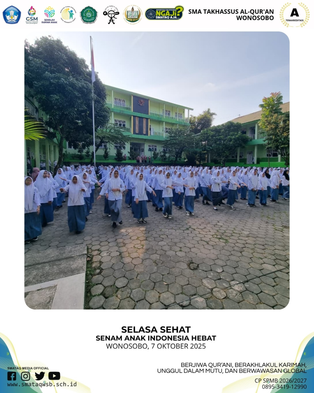 Wonosobo, 7 Oktober 2025 — SMA Takhassus Al-Qur’an Wonosobo kembali menggelar kegiatan rutin Selasa Sehat yang diisi dengan Senam Anak Indonesia Hebat. Kegiatan ini diikuti oleh seluruh siswa dan guru di halaman sekolah dengan penuh antusias dan semangat kebersamaan.