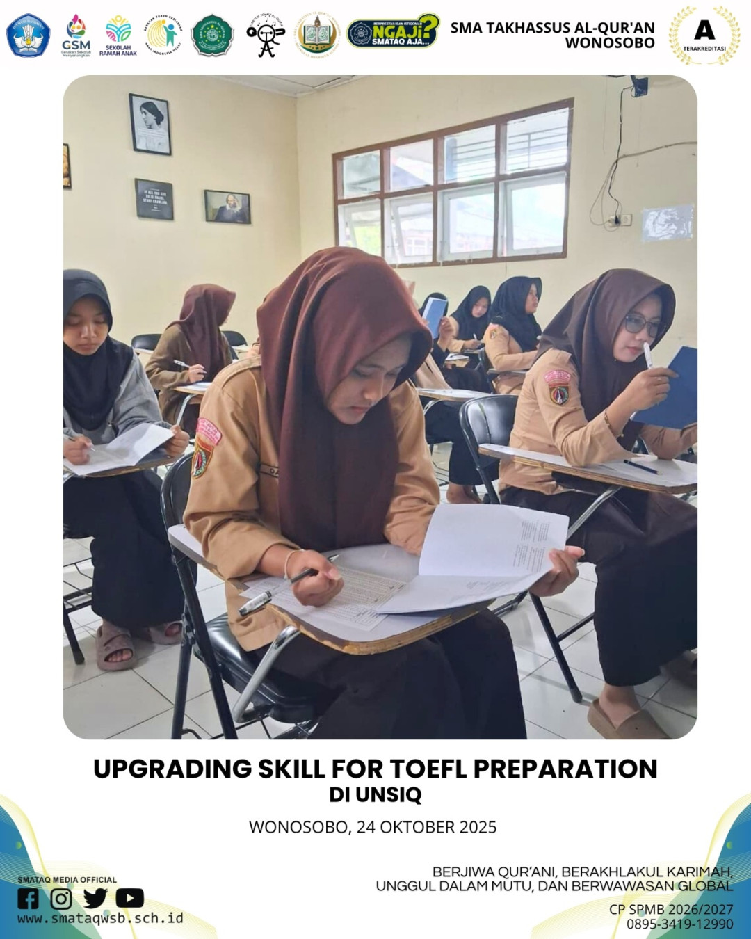 Wonosobo, 24 Oktober 2025 — Siswa-siswi SMA Takhassus Al-Qur’an Wonosobo mengikuti kegiatan Upgrading Skill for TOEFL Preparation yang diselenggarakan di Universitas Sains Al-Qur’an (UNSIQ) Wonosobo. Kegiatan ini berlangsung pada hari Jumat, pukul 13.00 hingga 15.00 WIB, dengan tujuan meningkatkan kemampuan siswa dalam menghadapi tes TOEFL sebagai salah satu bekal untuk melanjutkan studi ke jenjang yang lebih tinggi.