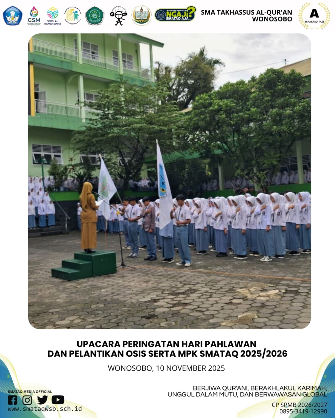 SMA Takhassus Al-Qur’an Wonosobo melaksanakan upacara peringatan Hari Pahlawan yang dirangkaikan dengan pelantikan pengurus OSIS dan MPK periode 2025/2026. Kegiatan berlangsung khidmat di halaman sekolah dengan diikuti seluruh siswa, dewan guru, serta jajaran pimpinan sekolah.